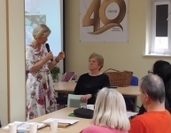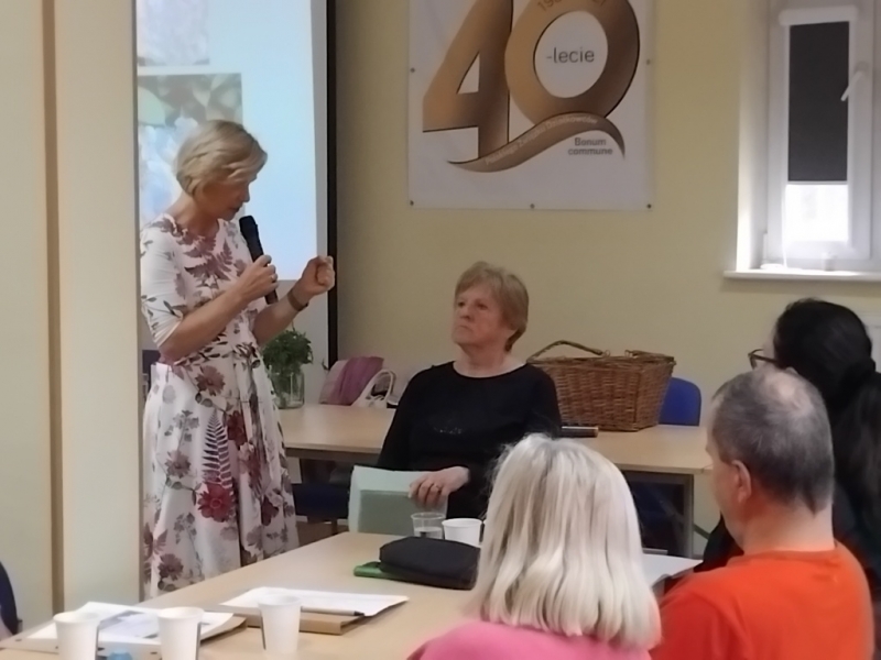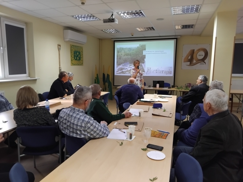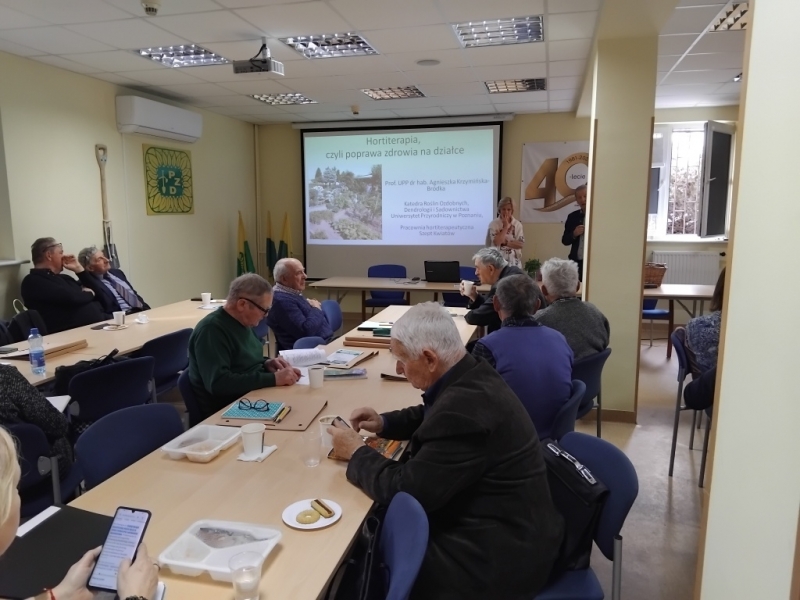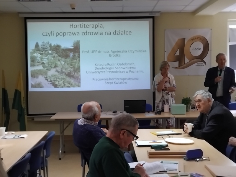 Drugi temat przedstawiła prof. UPP dr hab. Agnieszka Krzymińska z Katedry Roślin Ozdobnych, Dendrologii i Sadownictwa Uniwersytetu Przyrodniczego w Poznaniu, która omówiła, ale i zaprezentowała jak poprawić zdrowie na działce. Najważniejsze jest żyć zdrowo, jeść produkty roślinne, w tym kwiaty oraz umieć przystanąć i odpocząć w galopującym świecie. Pomimo, że samo posiadanie działki nie jest hortiterapią, to można przestrzeń działki traktować jako miejsce terapeutyczne poprzez umiejętność wyciszenia się i delektowania się roślinami, ale także umiejętnym wykonywaniem prac fizycznych na działce. Zwróciła uwagę na potrzebę umiejętności delektowania się szczegółami w przyrodzie i na działce. Chętni uczestnicy szkolenia mogli skosztować herbaty ze świeżych kwiatów forsycji.